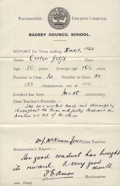 School Report 1941. During the Second World War some children were evacuated from the city to the relative safety of the Badsey countryside. This school report is for one evacuee child from Birmingham, Donald Jones. It was sent to us in 2002 by his son-in law Steve Hiatt. For the full story see An Evacuee's Tale.