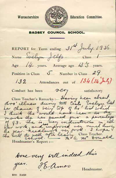 These two school reports have been lent to us by Evelyn Masters (née Jelfs) of Badsey, who attended Badsey Council School from 1927 to 1936. The class teacher in the 1932 report was Mr Bill McKanan-Jones, who later went to teach at Blackminster School when it opened in 1939. The class teacher in the 1936 report was Miss Maggie McDonald, sister-in-law of Frank Amos, the Headmaster.