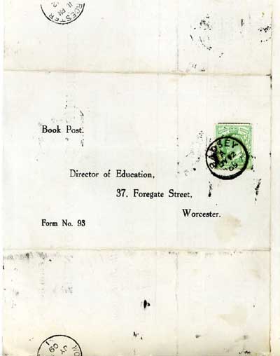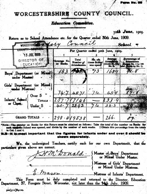 Attendance return. Every quarter, Head Teachers had to make returns to the local Education Committee concerning the number of attendances. This form shows the returns for Badsey Council School for the quarter ended 30th June 1909. The overall attendance record was 89%. The form was completed and signed by John Henry McDonald, Head of the Mixed Department, and Elizabeth Mason, Head of the Infant Department. The form had to be returned by 14th July 1909. The postmark reveals that it was sent on 12th July.