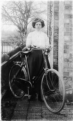 Miss Maud Byrd, with bike (note carbide lamp) (c 1906). Miss Byrd taught at Badsey School for many years. She was renowned for hitting pupils with the side of a ruler and threw chalk. She later married Bill Woodward, but came to an untimely end, being run over in Bengeworth. Peter Stewart lent us this photograph.