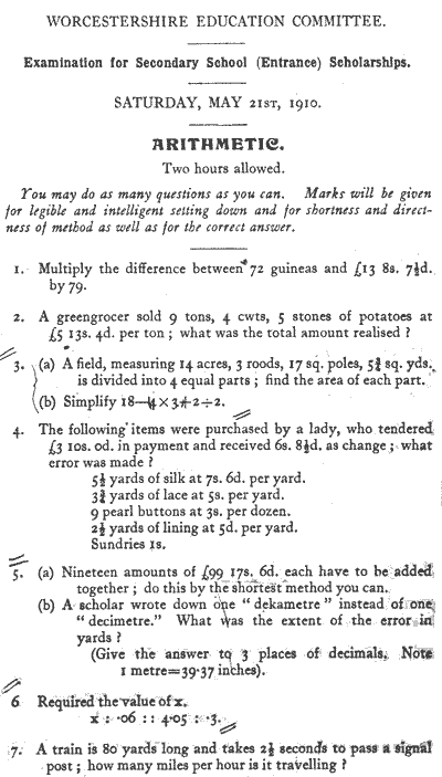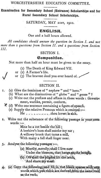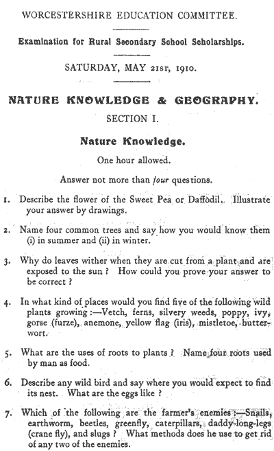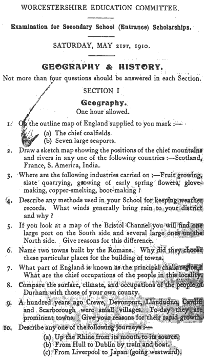 These 1910 examination papers were found at Worcester Record Office amongst papers relating to Badsey School. They are in Arithmetic (2 papers), English, Geography and History, and Nature Knowledge and Geography. The school entered a few of its most gifted students aged about 11. Very few scholarships were given and no one at Badsey School succeeded in 1910. Those who passed gained free secondary education.